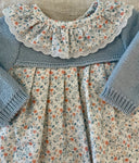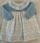 Knit and woven floral dress for baby girls. The bodice of the dress is knitted in a light blue color, and it has a ruffled collar in the same floral...