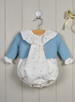 Beautiful romper for newborn babies made in soft cotton muslin in a cute greyish blue bird print. It has an oversized ruffled collar and long sleeves with elasticated frill cuffs. It fastens with wooden buttons on the back and between the legs for additional comfort. Cardigan not included.