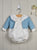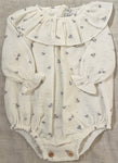 Beautiful romper for newborn babies made in soft cotton muslin in a cute greyish blue bird print. It has an oversized ruffled collar and long sleeves with elasticated frill cuffs. It...