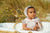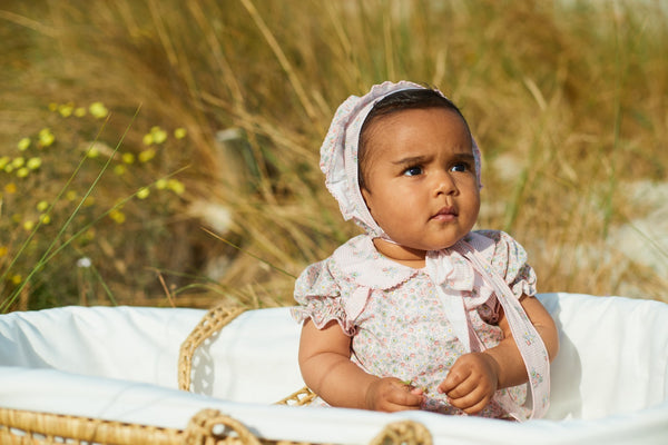 Cute romper for baby girls. Made in a floral print fabric in a soft color palette, it features a Peter Pan collar in a contrasting light pink and white gingham fabric with flowers. It has puffed elasticated sleeves and it fastens with buttons on the back and between the legs. *Bonnet not included.