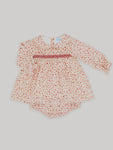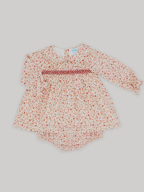 Bloomer set for baby girl in a dark red floral print. It features a dark red smocked detail on the chest and a Peter Pan collar. The dress has long elasticated sleeves and it fastens on the back with buttons. It comes with matching bloomers.