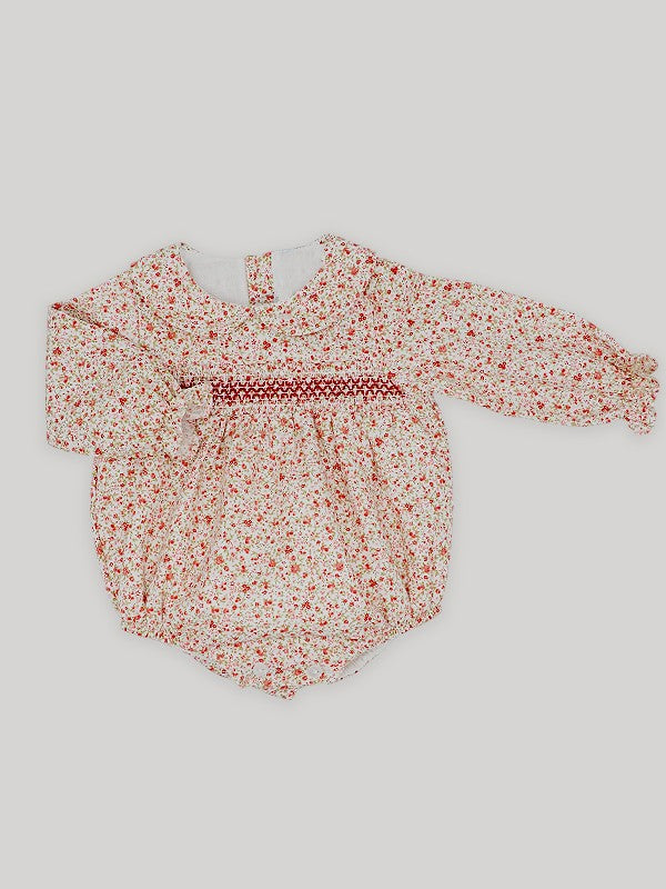 Smocked romper for baby girl in a dark red floral print. It features a dark red smocked detail on the chest and a Peter Pan collar. The romper has long elasticated sleeves and it fastens on the back with buttons.