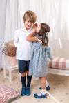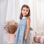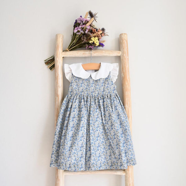 Classic floral dress in a beautiful blue Liberty fabric. It has a white scalloped collar and white ruffles around the arm openings. It fastens on the back with buttons and a bow. Made in cotton. Fully lined.
