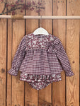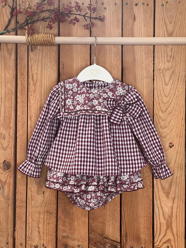 Bloomer set for little girls, it includes a blouse in a bordeaux and white gingham fabric, and a ruffled bloomer in a contrasting bordeaux floral fabric. The blouse has a bib collar in the same floral fabric as the bloomer, decorated with a bow. It has long elasticated sleeves with frilled cuffs, and it fastens on the back with buttons. The bloomers are elasticated around the waist and leg openings.