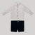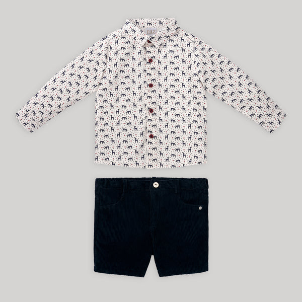 Cute 2-piece boy set, it includes a long-sleeved shirt and shorts. The white shirt features a festive red and navy reindeer print and it buttons on the front with red buttons. The navy corduroy shorts have an elasticated waist for additional comfort.