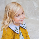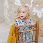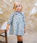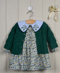 Beautiful dress for little girls made in a floral green and yellow fabric. It has a contrasting light blue Oxford collar with a hand-embroidered green floral detail. The dress fastens on the front with 3 buttons and has long sleeves with elasticated frill cuffs. Cardigan not included. It runs true to size.