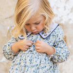 Beautiful dress for little girls made in a floral green and yellow fabric. It has a contrasting light blue Oxford collar with a hand-embroidered green floral detail. The dress fastens...