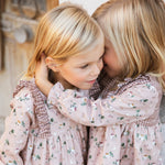 Pastel pink dress for little girls in a cute farmhouse print. The dress has frills on the front in a contrasting pink gingham fabric. The long sleeves have elasticated frill cuffs. The dress fastens with wooden buttons on the back.