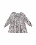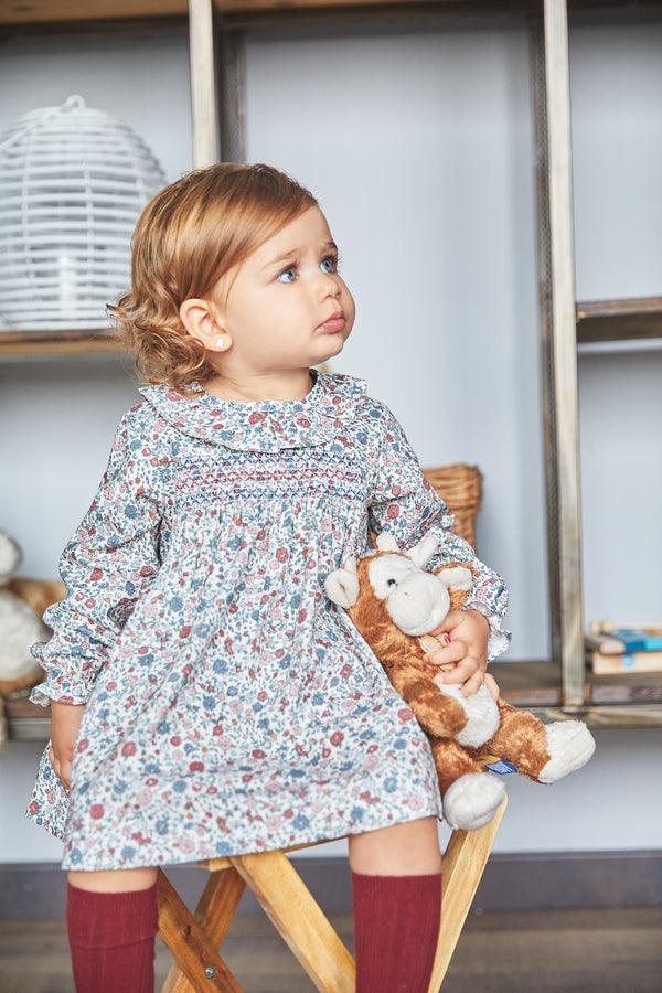 Traditional toddler girl dress in a beautiful pink, blue and burgundy floral print. It has an embroidered detail on the chest and a ruffled collar. The dress has long sleeves with elasticated cuffs and it fastens on the back with buttons. It comes with matching bloomers.