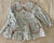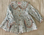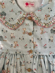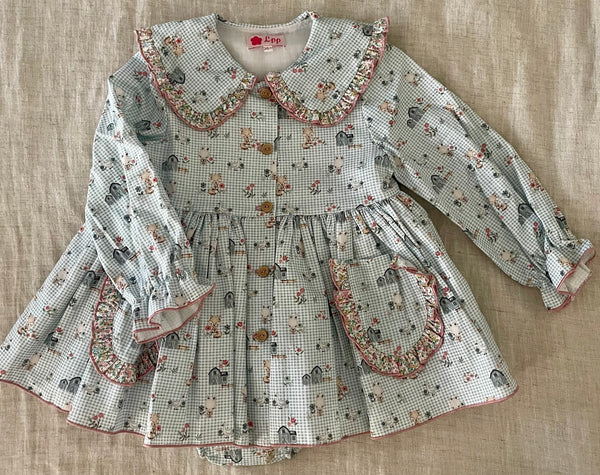 This dress is made in a cute sage green gingham fabric with animal motifs. It has frontal pockets and a Peter Pan collar with a ruffle in a contrasting floral print. The dress has long elasticated sleeves and it fastens with wooden buttons on the front. It comes with matching bloomers.