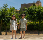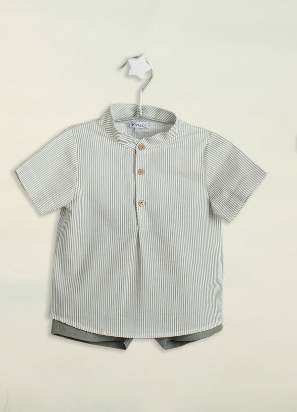 Green toddler boy set, it is perfect for summer. The collarless green and white striped shirt has short sleeves and wooden fastenings on the front. The green shorts are made in a lightweight blend of cotton and linen, and they have an elasticated waist. Mebi is a small fitting brand, we recommend sizing up.