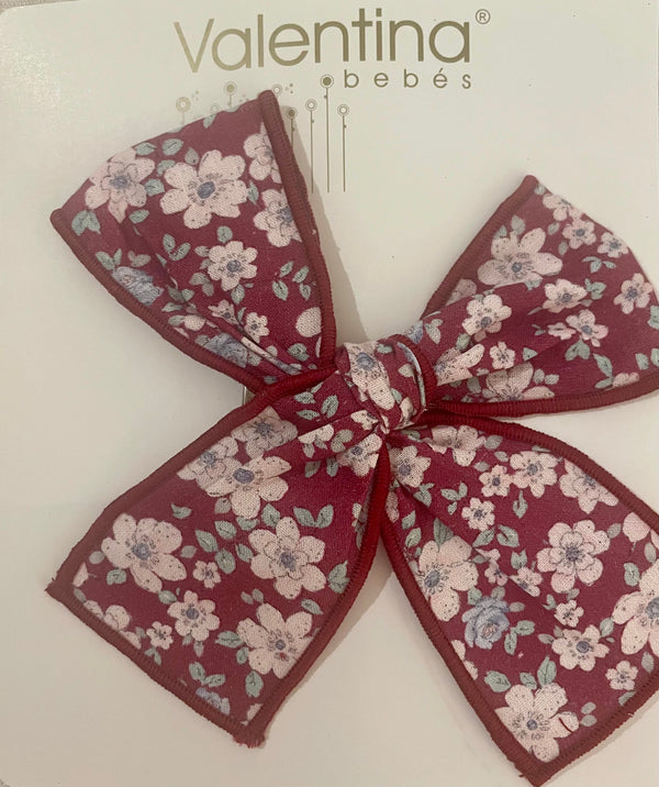 Hair bow with clip in a bordeaux floral print.