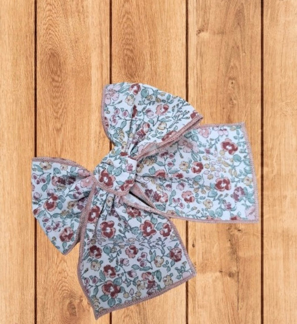 Hair bow with clip in the pink liberty print.