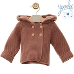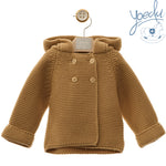Unisex knit coat with hood. It features double breasted buttoning. Available in navy, off-white, camel and powder pink.