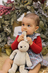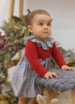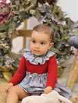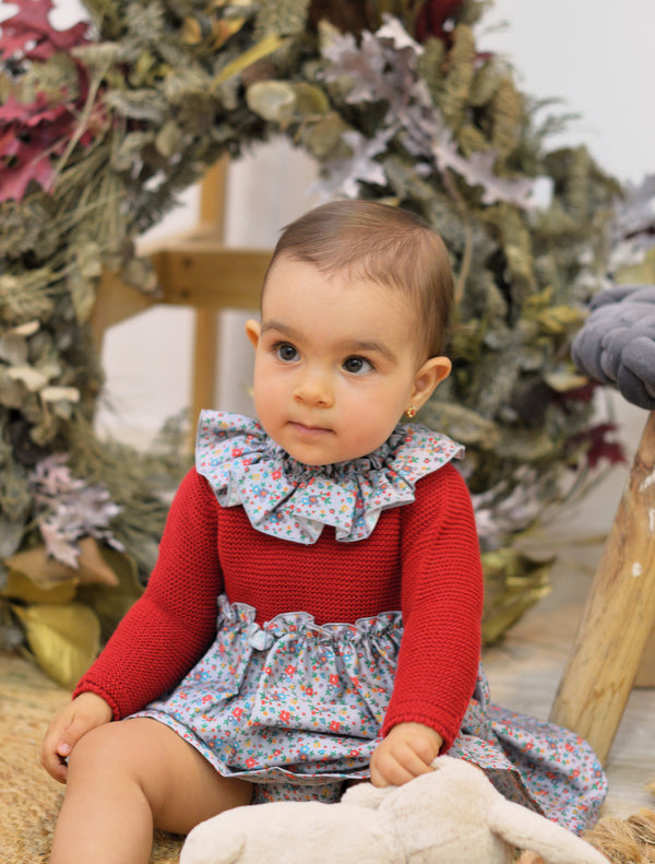 Knit red dress with a light grey fabric skirt in a floral red print. It features a ruffled collar in the same fabric as the skirt. The dress has long sleeves and it fastens with buttons on the back. It comes with matching bloomers. There is a matching version for girls.