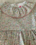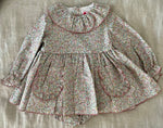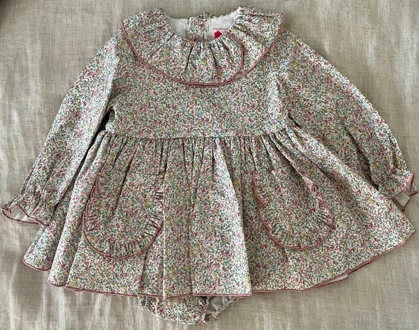 This dress is made in a beautiful pink floral fabric. It has frontal pockets and a ruffled collar, and long elasticated sleeves. The dress fastens on the back with buttons, and it comes with matching bloomers.
