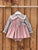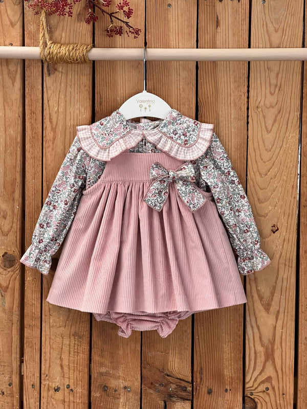 Pink corduroy pinafore dress and pink liberty blouse set. The long-sleeved blouse has an oversized Peter Pan collar with a contrasting white and pink gingham ruffle. The dress is adorned with a pink liberty bow on the front, and it fastens on the back with buttons. It comes with matching bloomers.