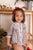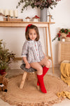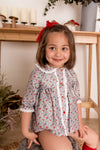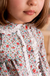 Light grey dress in a floral red print. It features a Peter Pan collar and long sleeves. The dress fastens with red buttons on the front, and it has a white ruffled detail along the front panel, collar and sleeves. It comes with matching bloomers.