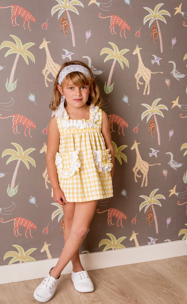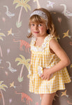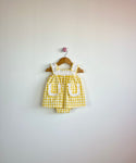 White and yellow gingham dress with a square neckline and frontal pockets. It has a white ruffle detail around the neckline and pockets. The dress comes with matching bloomers, and...