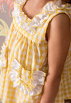 White and yellow gingham dress with a square neckline and frontal pockets. It has a white ruffle detail around the neckline and pockets. The dress comes with matching bloomers, and it fastens on the back with buttons.