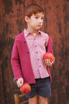 This boy set includes a button-down shirt in a bordeaux and white gingham fabric and dark blue velvet shorts. The shorts have an elastic waist and pockets. The sweater is...
