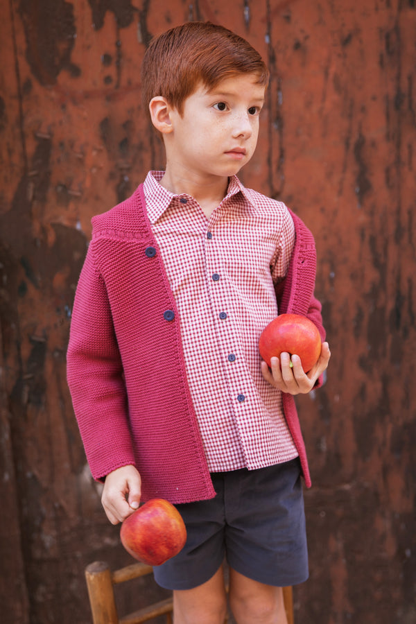 This boy set includes a button-down shirt in a bordeaux and white gingham fabric and dark blue velvet shorts. The shorts have an elastic waist and pockets. The sweater is sold separately.