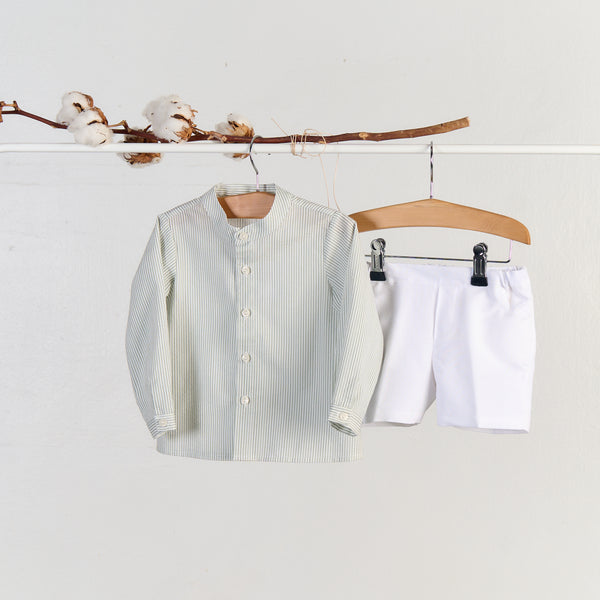 Toddler boy shirt and shorts set. The long-sleeved collarless shirt is made in a white and green striped fabric. The white shorts are elasticated on the back.
