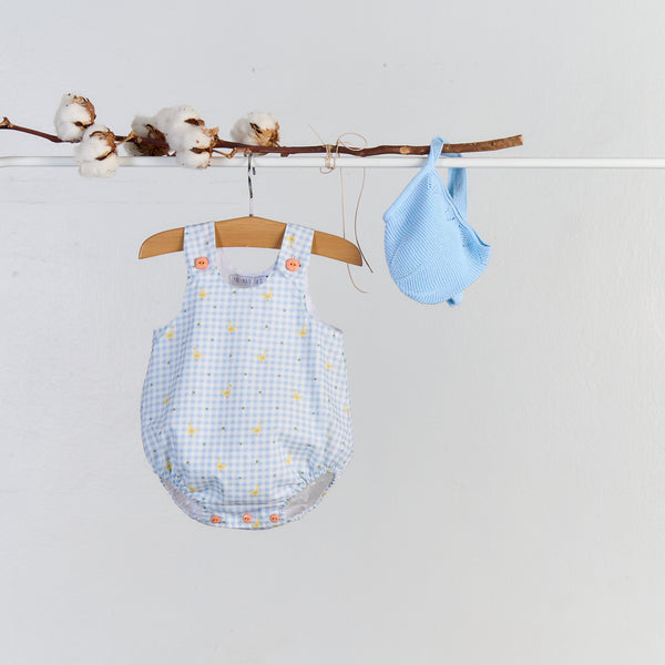 Unisex baby romper in a sky blue and white gingham fabric with printed yellow ducks. It is elasticated around the leg openings. The romper fastens with buttons on the straps and between the legs.