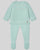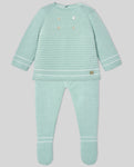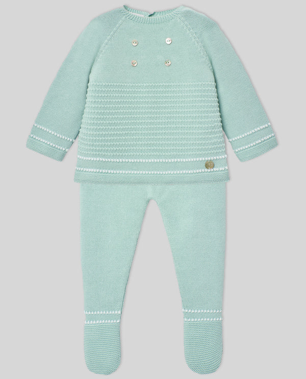 Two-piece acqua green knit set for boys and girls. It includes a long-sleeved sweater and footies. Knitted in soft cotton, the top has white intricate details and is adorned with faux mother-of-pearl buttons on the front. It fastens with buttons on the back. The footies are gently elasticated around the waist.