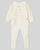 Two-piece cream knit set. It includes a long-sleeved sweater and footies. Knitted in soft cotton, the top features a Peter Pan collar and two decorative mother-of-pearl buttons. It fastens with buttons on the back. The footies are gently elasticated around the waist.