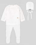 Three-piece white knit set for baby boys and girls. It includes a long-sleeved sweater, footies and a bonnet. Knitted in soft cotton, the top fastens with buttons on the shoulder...