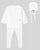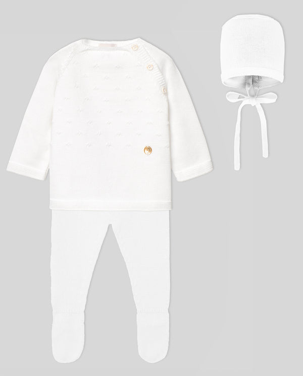Three-piece white knit set for baby boys and girls. It includes a long-sleeved sweater, footies and a bonnet. Knitted in soft cotton, the top fastens with buttons on the shoulder and is adorned with a mother-of-pearl logo on the front. The footies are gently elasticated around the waist.
