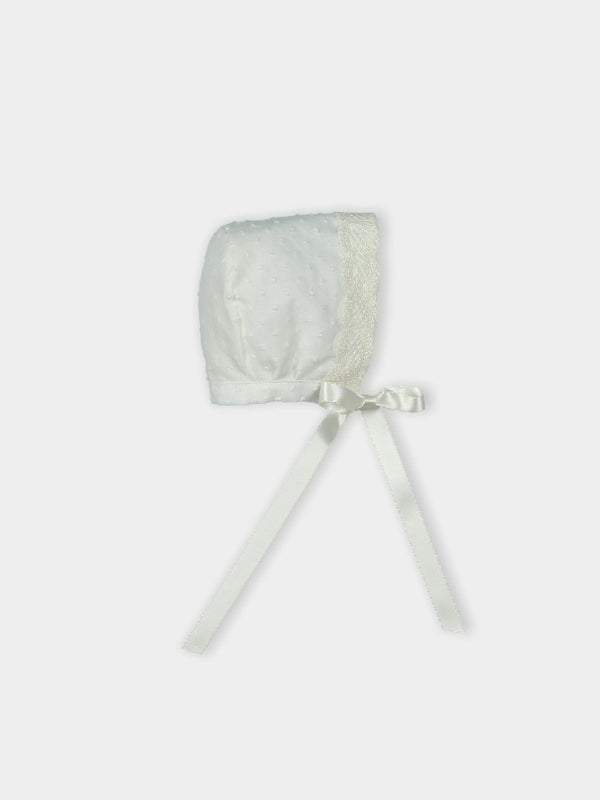 Ecru plumeti bonnet with lace detail and satin ribbon. It matches dress Susurro, romper Susurro and gown Susurro.