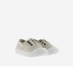 Beige canvas sneakers without shoelaces. Made in dyeable recycled eco cotton (DREC), they have an elastic band inside and rubber toe cap. Easy to wash. Small fitting style - we recommend you go up one size.