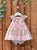 Cute dress for girls in a pink gingham fabric. It features a ruffled collar and frontal pockets in a pink liberty fabric, creating a beautiful contrast. The dress fastens with wooden buttons on the front and comes with matching bloomers in the liberty fabric.