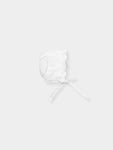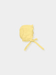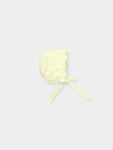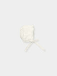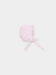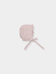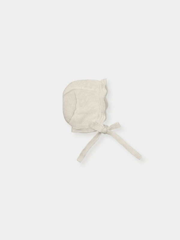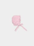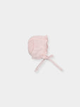 Knit bonnet with openwork detail all around. and ties.