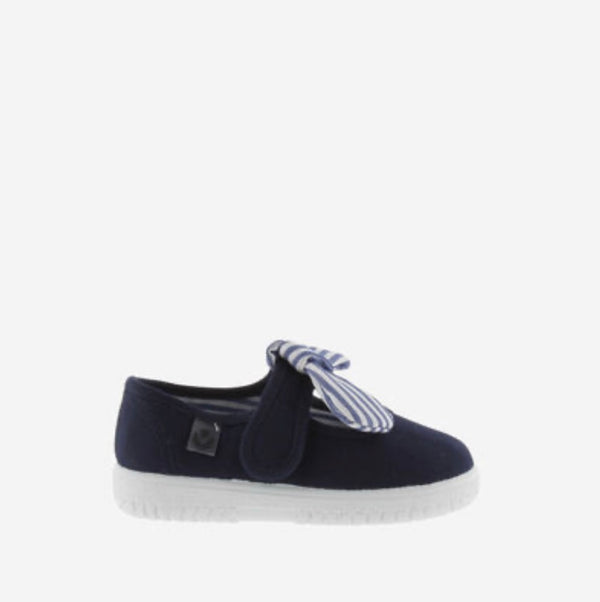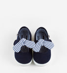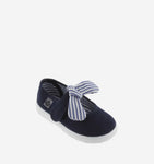 Navy canvas Mary Janes made in ecological cotton. The white and blue striped bow can be detached. Velcro fastening. Easy to wash.
