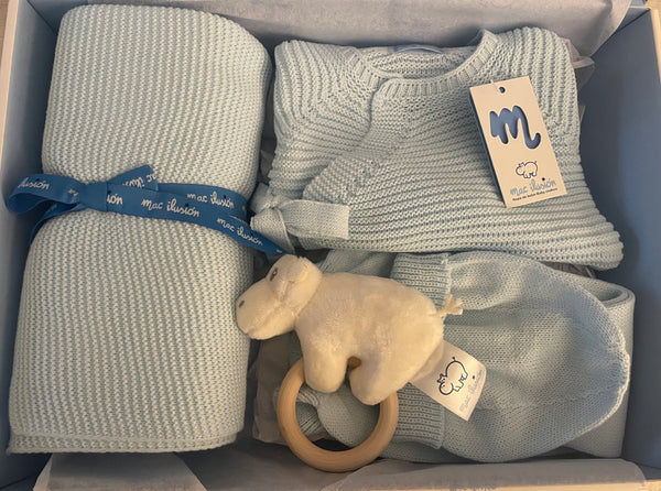 Beautiful gift box for a newborn baby boy. It includes a 3-piece baby blue knit set (long-sleeved sweater, matching footies and hat), a matching blanket and a rattle. The kimono sweater ties on the side, allowing for easy changes.