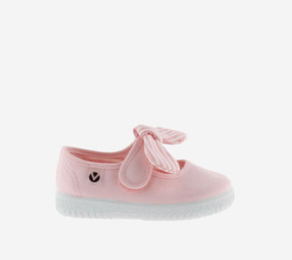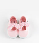 Pink canvas Mary Janes made in ecological cotton. The pink and white striped bow can be detached. Velcro fastening. Easy to wash.