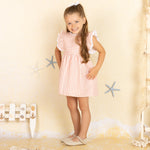 Striped terracotta pink and white dress for girls, made in a blend of linen and cotton. This sleeveless dress features ruffles around the arm openings and a cute V-neckline and...