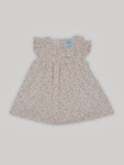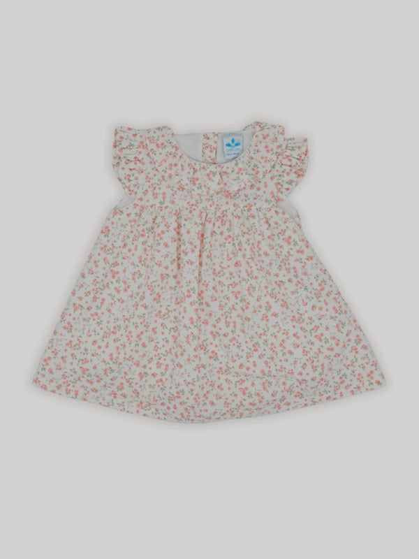 Baby girl dress made in lightweight cotton, this is a great everyday summer dress. Made in a white and pink floral print, it features a ruffled collar and sleeves, and it fastens on the back with buttons.
