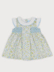 Smocked dress for girls. Made in a beautiful blue and green floral fabric, it features a frontal panel with four faux buttons and a blue smocked detail across the chest, and white fabric frills along the neckline and arm openings. It fastens with buttons on the back. Sizes 4 and 6 feature a bow on the back.