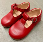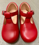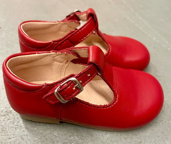 Classic unisex leather T-Straps with buckle closure. Handcrafted in Spain in the softest dark red leather. Elevate any outfit with this classic, high-quality, artisanal style.