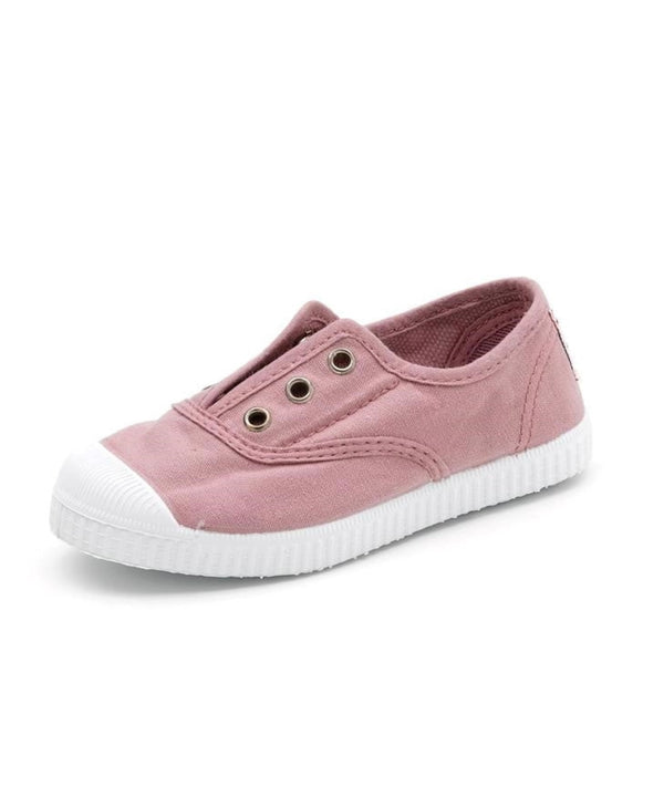 This laceless canvas style features a hidden inner elastic band, rubber cap toe and non-slip outsole. Easy to wash. Small fitting style - we recommend going up one size.