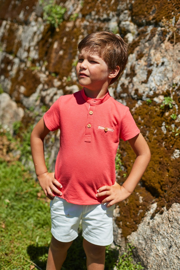 Shorts set for boys. The short-sleeved coral polo shirt has no collar and fastens with three wooden buttons on the front. It features a faux pocket on the chest. The white shorts are elasticated around the waist and have pockets.