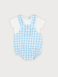 This dungaree set for baby boys includes a white cotton short-sleeved shirt and white and blue gingham dungarees. The shirt fastens with buttons on the back. The lightweight dungarees fasten on the front with buttons and in between the legs for easy changes. They feature a frontal pocket with a button.