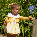 Cute dress for girls made in a diagonal white and yellow gingham pattern. It features a solid white square bib and flutter sleeves. It comes with matching elasticated bloomers and it fastens with buttons on the back.