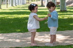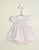 Baby girl bloomer set made in lightweight cotton, the white top has a cute floral print in pastel pink hues. It has flutter sleeves, and it fastens with buttons on the back. The striped white and coral bloomers are elasticated around the waist and leg openings. Beautiful summer set for baby girls. Mebi is a small fitting brand, we recommend sizing up.