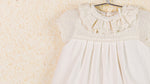 Traditional knit and woven ivory dress for baby girls. The body of the dress is knitted in delicate ivory cotton. It has short sleeves and a ruffled collar. The skirt...