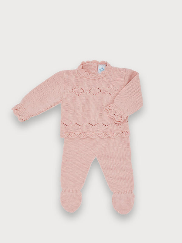 Newborn 2-piece pastel pink knit set. It includes a long-sleeve sweater and matching footies. The sweater fastens with buttons on the back. The footies are gently elasticated around the waist.
